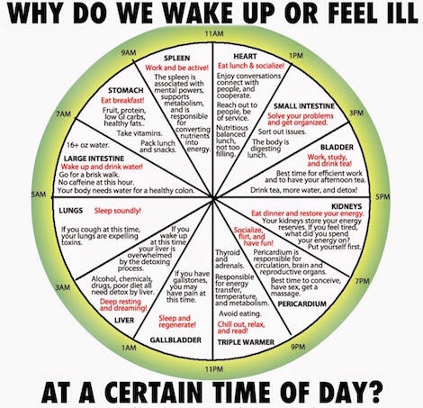 Chi energy moves through each meridian every two hours as seen above, beginning with the lungs at 3am everyday. During those two hours of focus, the meridian and its corresponding organ works to invite and activate optimal performance, maintenance and repair if needed, providing release of stagnation or blockages. Looking at the chart above, directly opposite each organ is another organ, so that whilst one is at peak focus, the opposing is in low focus.The body clock is natures way of guiding our health. Each organ represents specific actions and functions mentally and physically. Our internal clock directs us as to what time is best to eat, to sleep, to play, to engage in sports, to study, to create, to travel, to party, to have sex, even when to to take medication or to have chemo etc so that our Chi can be flowing freely, balanced and energized, thus enhancing our body, mind and spirit.Want to know why you are more likely to have a heart attack in the morning, or crash your car around 2pm? Watch this BBC Horizon Documentary: "The Secret Life of Your Body Clock" - http://topdocumentaryfilms.com/the-secret-life-of-your-bodyclock/