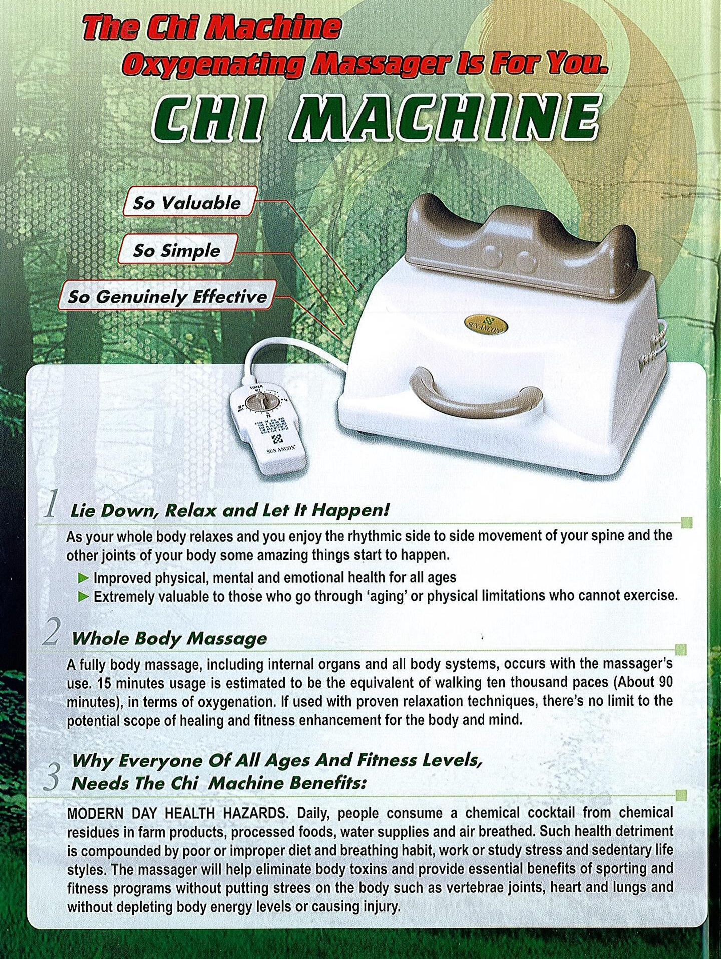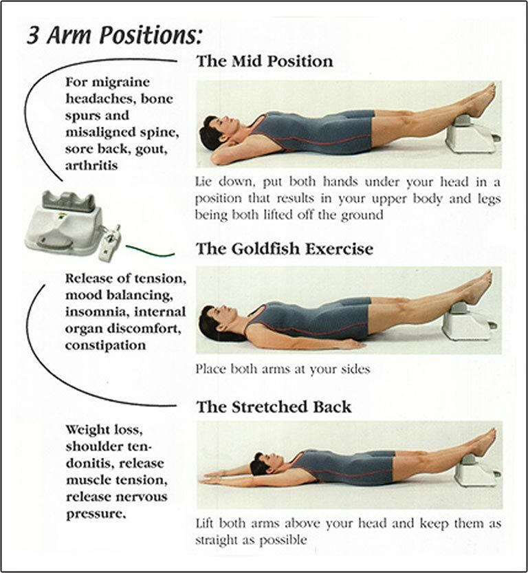 Placing the arms above the head creates traction throughout your whole body helping to temporarily relieve muscular tension, stress and discomfort.The original Chi Machine creates effortless, sweatless, physical movement, regardless of age, health or fitness level - simply lie down and relax in the comfort of your own home - an excellent option when the weather is not conducive to outside activity. At work? Take 10 minutes to refresh, regroup, calm the body and boost mental focus.1) The Chi Machine does NOT exercise or build muscles which is considered anaerobic and requires weight resistance.2) The original Chi Machine has NEVER been promoted or intended for serious weight loss. However, it may be noted that weight loss, has been reported by countless users.Relaxation promotes health"One of the wonderful benefits of The Chi Machine is that it allows the body to work effortlessly with its own natural frequencies. ... Each person's body is influenced by the sum total of all the physical, emotional, mental and chemical forces that it is exposed to, and its ability to respond effectively to those forces. As a result, each person will also respond differently to the normalization of fluid functions in his/her body. If we pin our hopes on any one thing to take away our discomfort, we will be disappointed more often than not. What is most important is not that a specific symptom or condition reduces or disappears, but that the effects are produced to help the body perform to its full potential. Ultimately, this is the way the body moves toward better health." - Dr. Jan Kirschne, "Healing From The Inside Out".